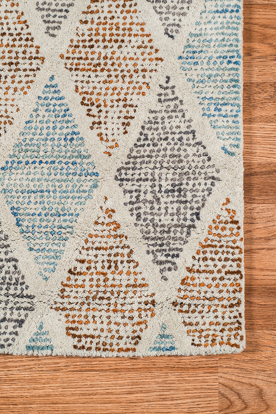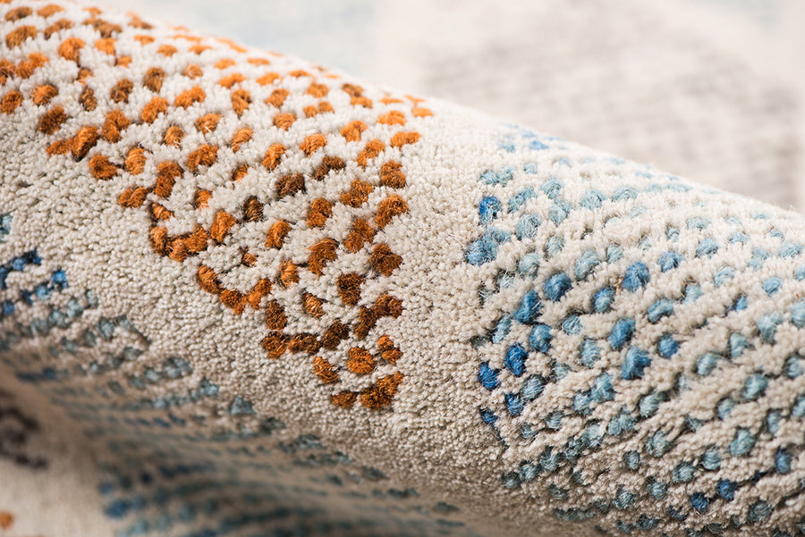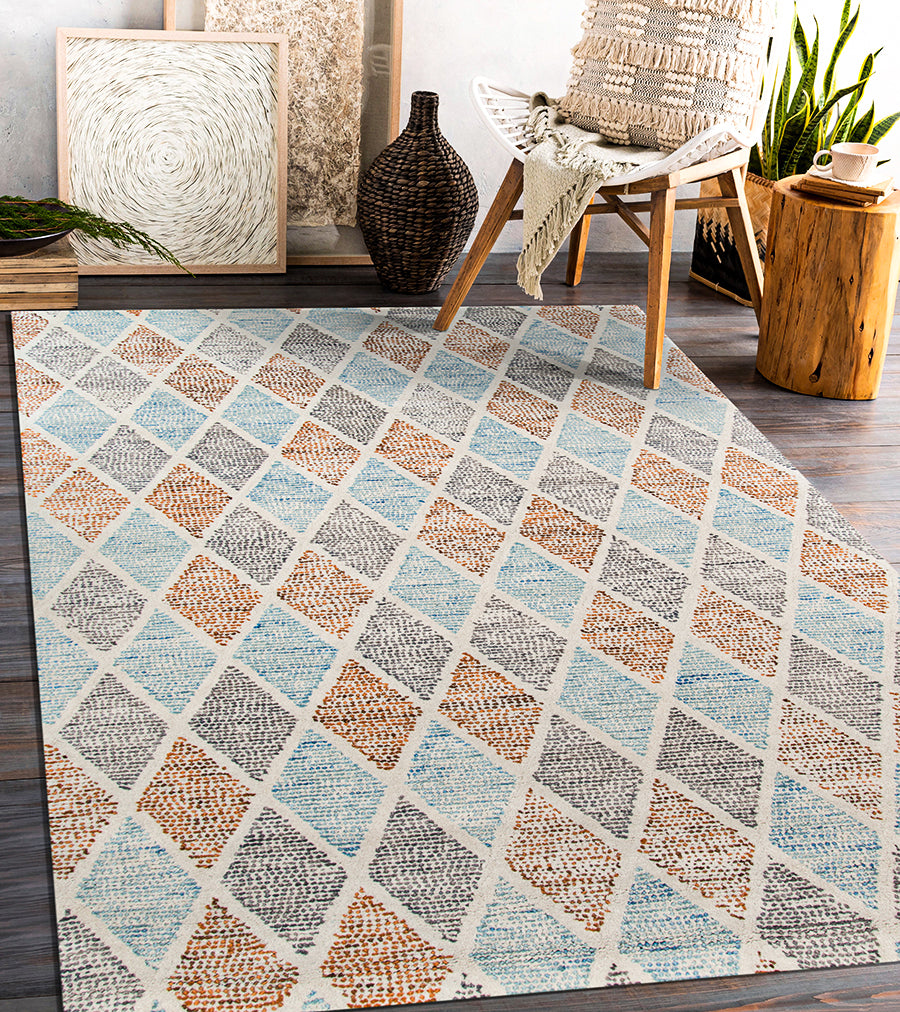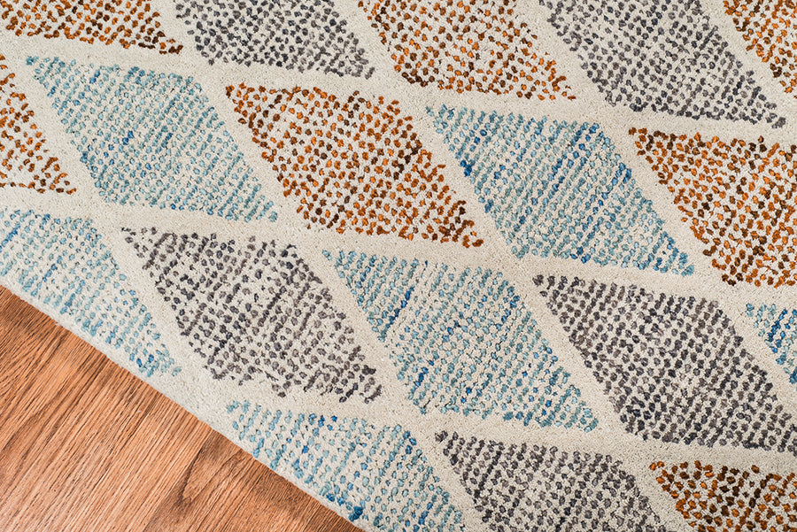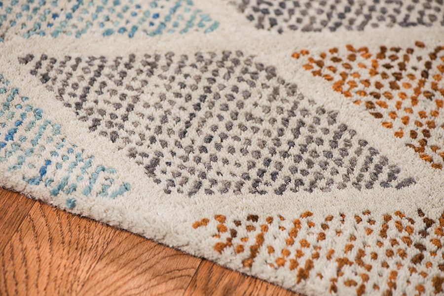 Mit ihren kühnen, modernen Designs und Farben, die von verschiedenen Wüsten-Ökosystemen inspiriert sind, werden diese Teppiche sicherlich ein beliebter Akzent in Ihrem Zuhause sein. Mit seinen komplementären geometrischen Mustern, die perfekt zu einer Vielzahl von Einrichtungsstilen passen, werden Sie leicht einen Platz für dieses Bodenkunstwerk in Ihrem Zuhause finden. Handgetuftet in Indien aus feinster, natürlicher neuseeländischer Wolle ist er nicht nur wunderschön, sondern auch weich und angenehm zu betten.