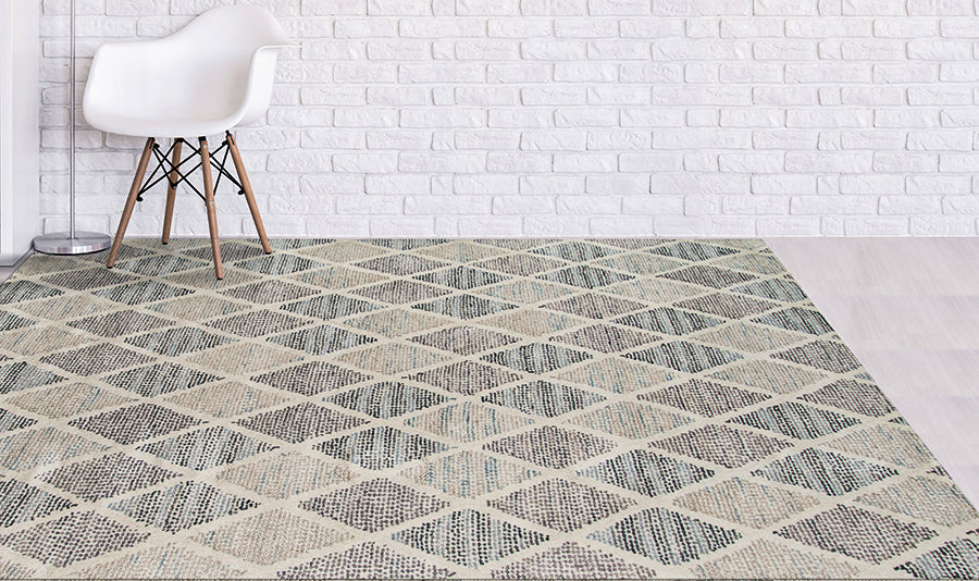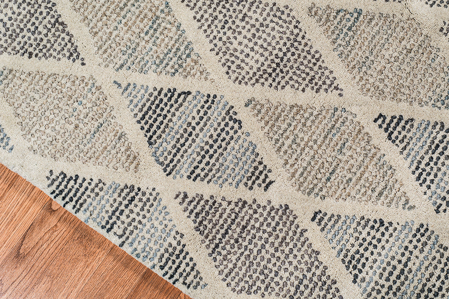 Mit ihren kühnen, modernen Designs und Farben, die von verschiedenen Wüsten-Ökosystemen inspiriert sind, werden diese Teppiche sicherlich ein beliebter Akzent in Ihrem Zuhause sein. Mit seinen komplementären geometrischen Mustern, die perfekt zu einer Vielzahl von Einrichtungsstilen passen, werden Sie leicht einen Platz für dieses Bodenkunstwerk in Ihrem Zuhause finden. Handgetuftet in Indien aus feinster, natürlicher neuseeländischer Wolle ist er nicht nur wunderschön, sondern auch weich und angenehm zu betten.